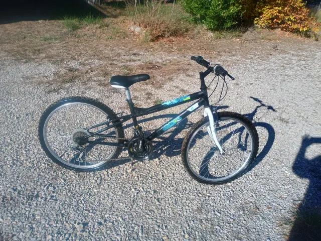 Detalles del productoBicicleta de montaña en color negro con detalles azules y verdes en el cuadro. Ideal para paseos y rutas.