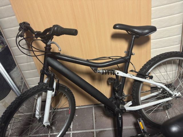 Bicicleta de montaña con cuadro negro y detalles blancos. - Ruedas todoterreno. - Suspensión delantera y trasera. - Sillín negro. - Manillar con puños negros.