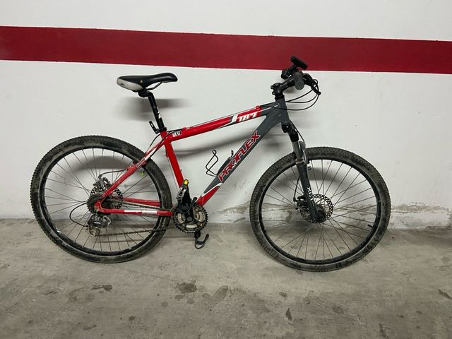 Detalles del productoBicicleta de montaña Proflex con cuadro rojo y gris. Ideal para senderos y caminos.