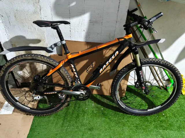Detalles del productoBicicleta de montaña Razesa de Carbono con un llamativo diseño en naranja y negro. Ideal para disfrutar de rutas y senderos. Talla M