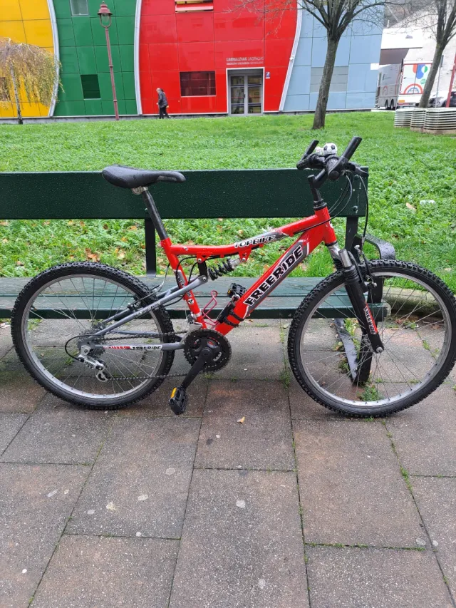 Bicicleta de montaña de color rojo, ideal para paseos y aventuras. - Cuadro de aluminio. - Suspensión delantera y trasera. - Ruedas de 24 pulgadas