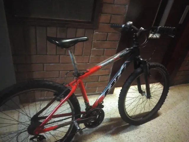 Bicicleta de montaña con un diseño llamativo en rojo y negro. - Cuadro de aluminio. - Suspensión delantera. - Frenos de Zapata