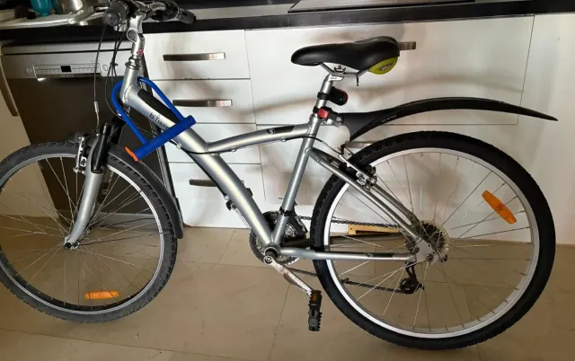 Detalles del productoBicicleta de paseo en color plateado, ideal para desplazamientos urbanos.