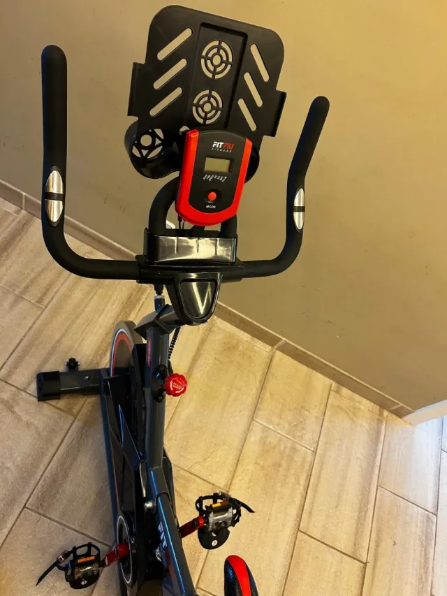 Bicicleta de spinning FITFIU en color negro y rojo. - Pantalla digital. - Soporte para tablet o móvil. - Pedales con agarre. - Resistencia ajustable.