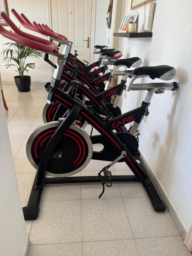 Detalles del productoSe venden 6 bicicletas de spinning profesionales Care Spider Pro, usadas pero en buen estado, con algunas marcas de uso. Cuentan con estructura de acero al carbono muy resistente y transmisión por cadena. Nuevas cuestan sobre 500 euros, recién quitadas de un hotel