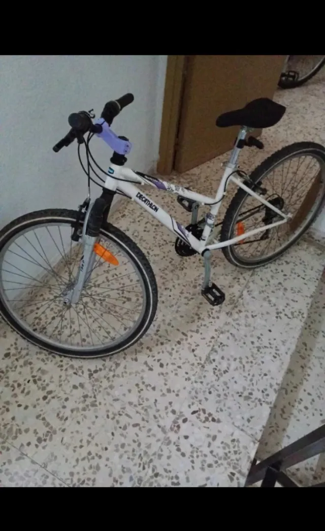 Bicicleta de montaña Decathlon en color blanco. - Cuadro de aluminio. - Suspensión delantera. - Frenos de disco.