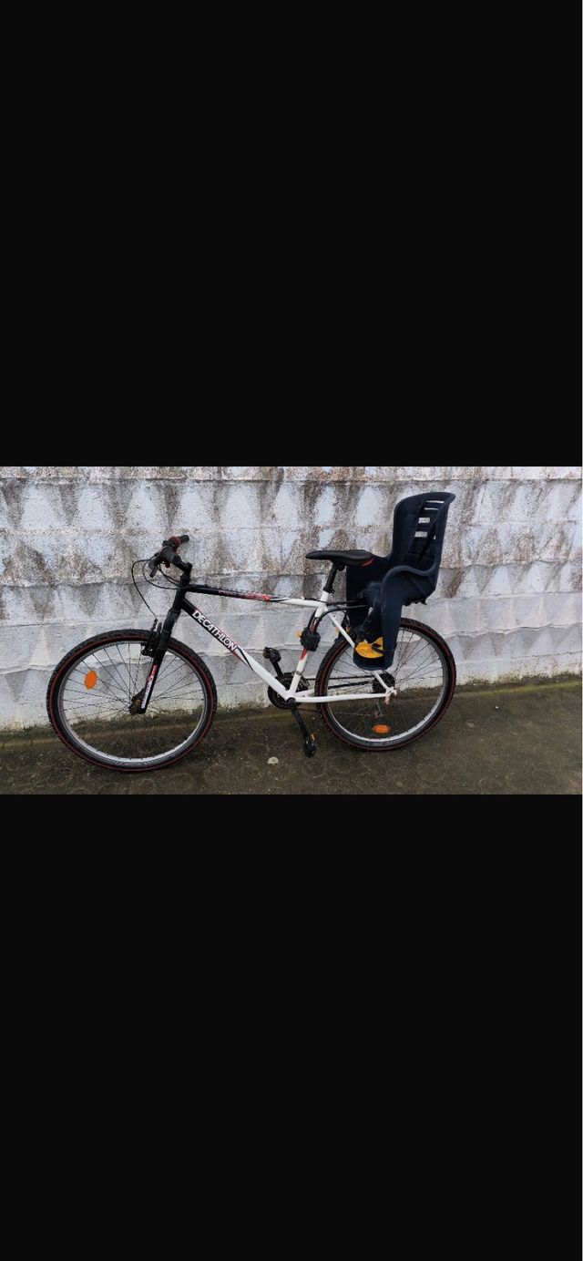 Se vende bicicleta Decathlon por no usarla. Incluye silla para niño. - Color blanco y negro. - Ruedas con aro rojo. - Silla de seguridad para bebé/niño.