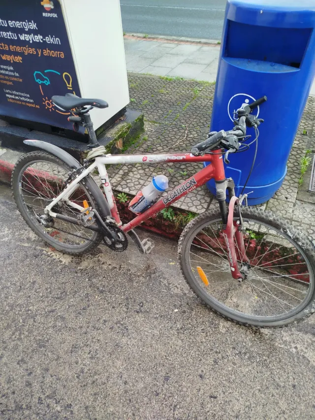 Bicicleta de montaña Decathlon con cuadro rojo y blanco. Incluye portabidon ruedas 26" y suspensión delantera
