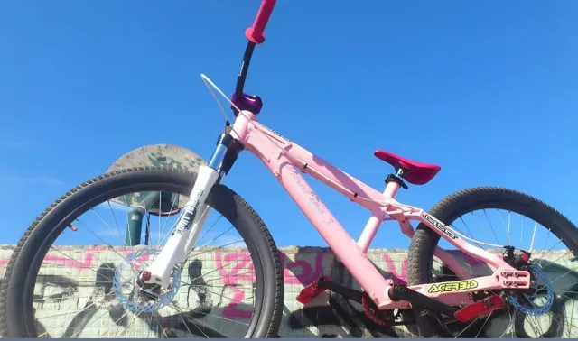 Detalles del productoBicicleta de descenso (DH) en color rosa.(como el rojo de ferrari) Ideal para terrenos difíciles y saltos.