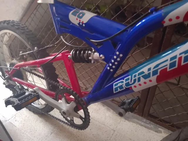 Detalles del productoBicicleta de montaña con doble suspensión, ideal para terrenos irregulares. Su diseño combina colores azul y rojo.