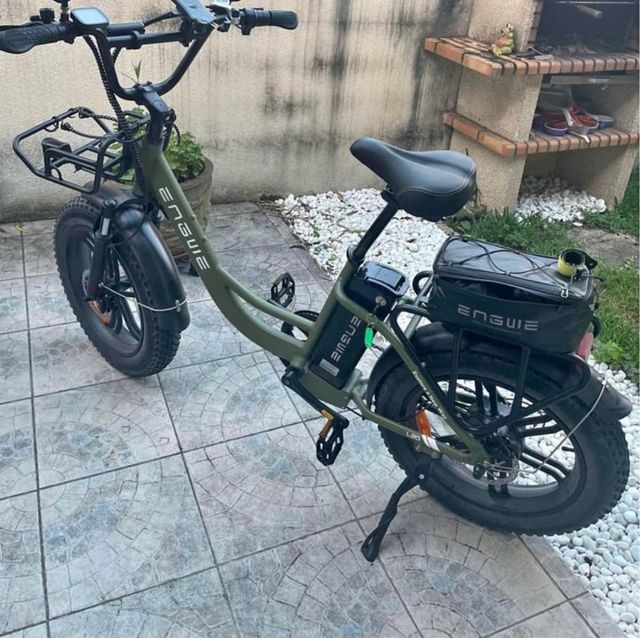 Detalles del productoBicicleta eléctrica de color verde con diseño robusto y moderno.