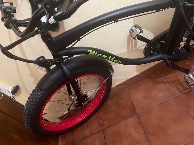 Detalles del productoBicicleta eléctrica Monster 26 estilo californiana en perfecto estado. valorada en 1790 € Es negra con nombre en verde y ruedas rojas , motor muy potente preferiblemente personas minimo de 1,70 motor muy potente,