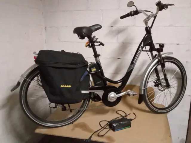 Detalles del productoBicicleta eléctrica Monty de color negro, ideal para desplazamientos urbanos. Cuenta con una bolsa de transporte en la parte trasera y un cargador.