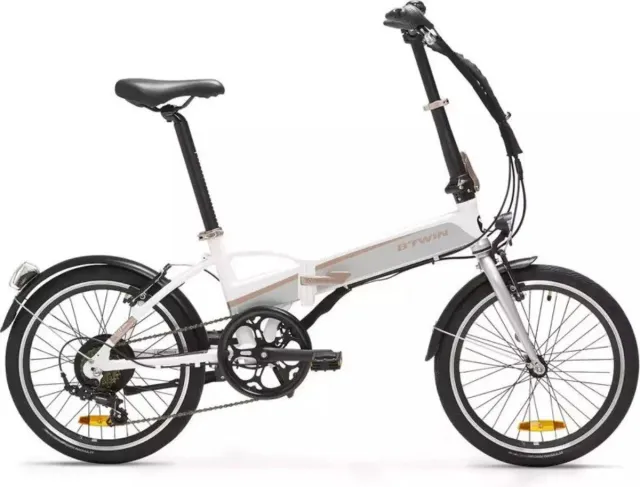 Detalles del productoBicicleta eléctrica plegable BTwin Tilt 500E en color blanco y detalles en cobre. Ideal para desplazamientos urbanos y fácil de almacenar.