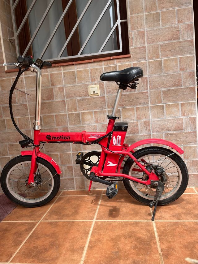 Bicicleta eléctrica plegable Emotion, en buen estado. Es roja y tiene un diseño moderno. - Marca: Emotion - Plegable - Color rojo - Incluye caballete