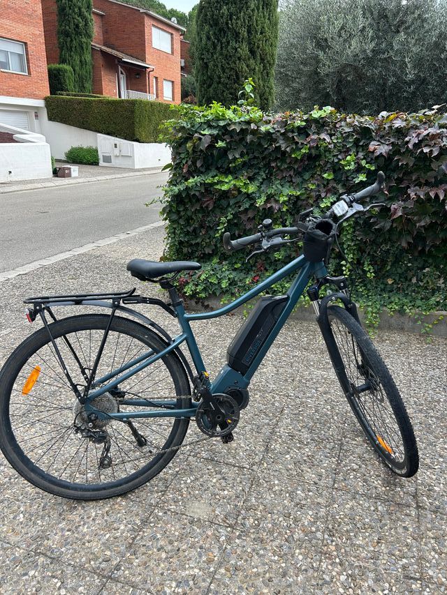 Detalles del productoBicicleta eléctrica trekking de color azul marino, ideal para desplazamientos urbanos o cicloturismo, trail