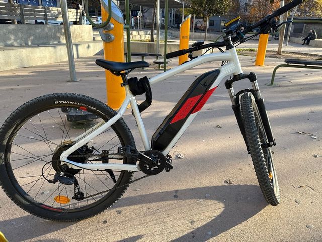 Detalles del productoBicicleta eléctrica Rockrider en color blanco y negro. Ideal para todo tipo de terrenos.