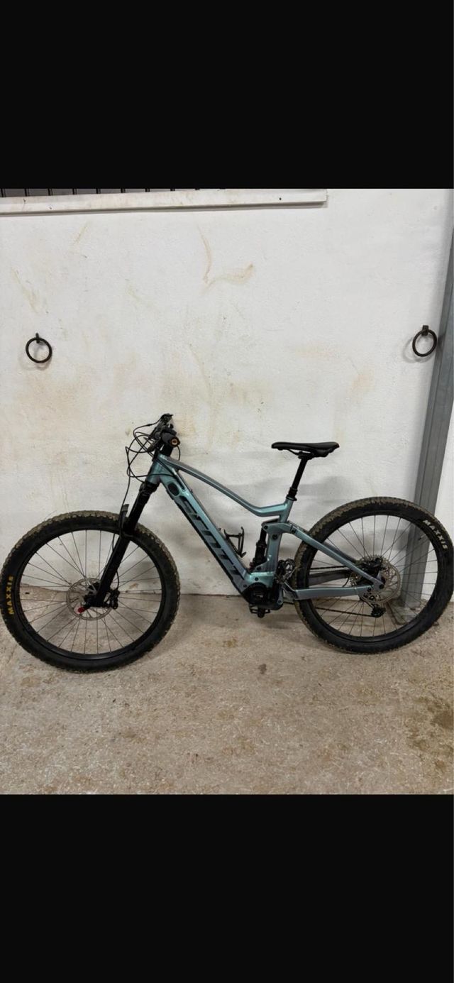 Bicicleta eléctrica Scott de montaña, con suspensión delantera y trasera. - Color gris verdoso. - Ruedas Maxxis. - Frenos de disco.