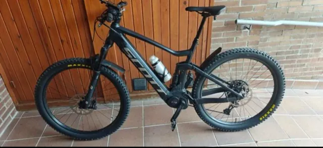 Detalles del productoBicicleta eléctrica Scott en color negro y gris. Cuenta con suspensión delantera y trasera, y un portabidón.