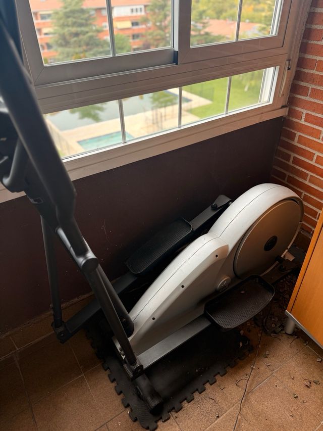 Bicicleta elíptica para entrenamiento en casa. - Diseño funcional. - Pedales amplios y antideslizantes. - Estructura robusta de color gris y blanco.