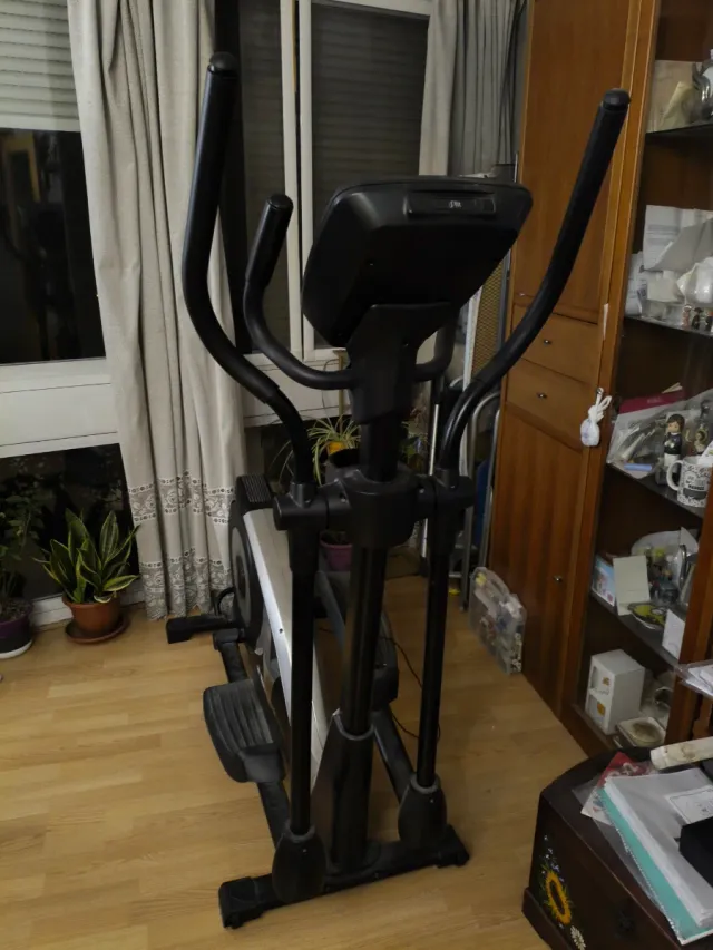 Bicicleta elíptica de color negro y plateado. - Diseño ergonómico. - Pedales antideslizantes. - Manillar con agarres acolchados.