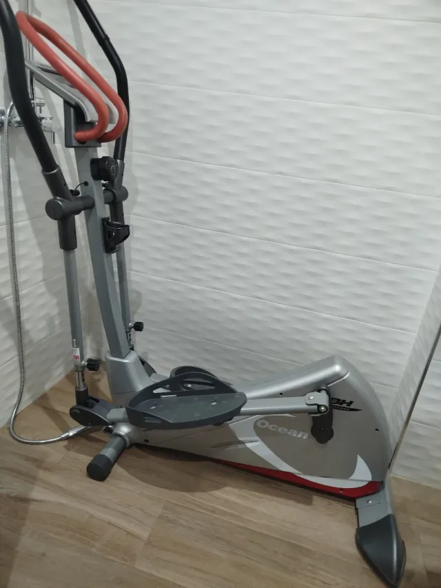 Bicicleta elíptica BH modelo Ocean. Con pantalla y programas . - Color gris con detalles en rojo y blanco. - Diseño moderno y compacto.