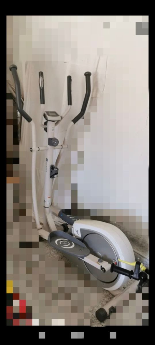 Bicicleta elíptica de color blanco, ideal para entrenamientos en casa. - Diseño compacto. - Pedales antideslizantes. - Pantalla digital. - Se quedo en una marcha y no cambia.