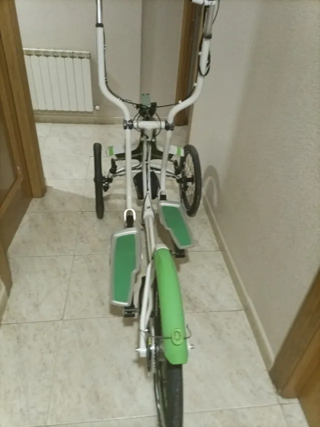 Detalles del productoBicicleta elíptica con un diseño moderno en blanco y detalles verdes.