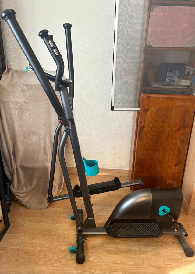 Detalles del productoBicicleta elíptica Domyos 120 en color gris y detalles en turquesa. Perfecta para ejercicio indoor.