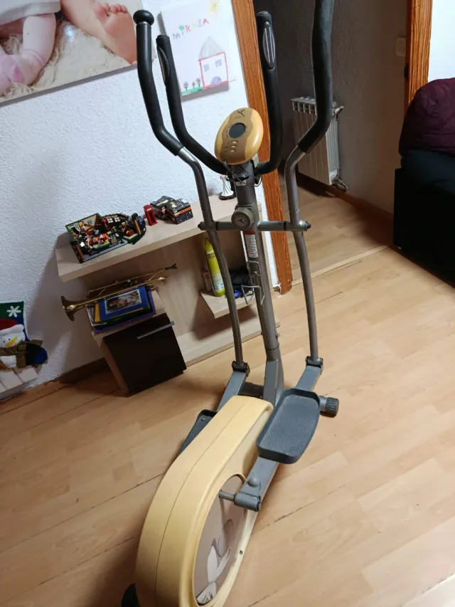 Bicicleta elíptica de la marca Domyos, ideal para entrenamientos en casa. - Diseño compacto. - Pantalla digital para seguimiento de ejercicio.