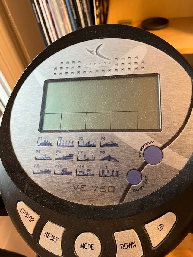 Bicicleta elíptica Domyos VE 750. - Pantalla digital con programas de entrenamiento. - Botones de control: ST/STOP, RESET, MODE, DOWN, UP.