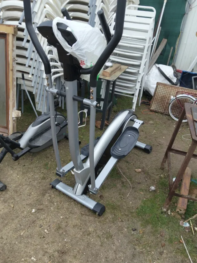 Bicicleta elíptica de color gris, ideal para entrenamientos en casa. - Diseño compacto. - Pedales antideslizantes. - Manillar ergonómico.