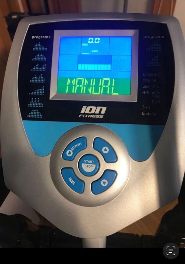 Detalles del productoBicicleta elíptica Ion Fitness en color gris y azul. Cuenta con pantalla digital que muestra velocidad, distancia y programa.
