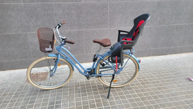 Detalles del productoBicicleta Elops 520 en color azul, ideal para paseos urbanos. Incluye sillita portabebé Hamax.
