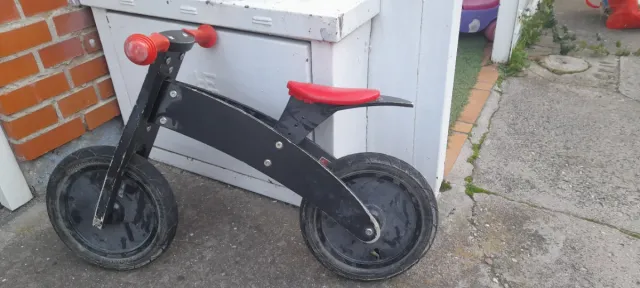 Bicicleta de equilibrio para niños, fabricada en madera. - Diseño en color negro. - Asiento rojo. - Ruedas negras.