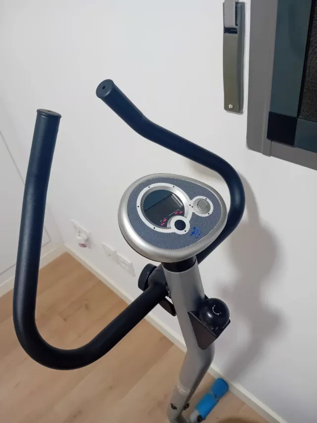 Bicicleta estática con pantalla digital y manillar ergonómico. - Pantalla con información de ejercicio. - Manillar con agarres acolchados. - Ajuste de resistencia.