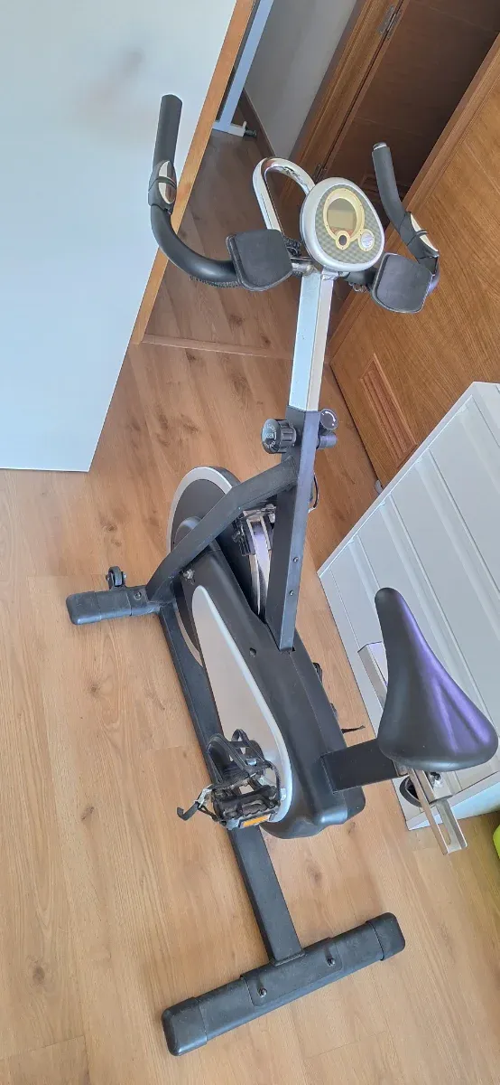 La pantalla LCD muestra el tiempo, la velocidad, la distancia, el pulso y las calorías quemadas, facilitando el seguimiento de tus objetivos. Ideal para ejercicios cardiovasculares. Asiento y manillar ajustables para adaptarse a diferentes alturas y preferencias. Sillín ergonómico en perfecto estado. Preparado para soporte de botellas. Equipada con dos ruedecitas para facilitar su transporte, junto con niveladores de suelo para mantener la estabilidad durante el uso .