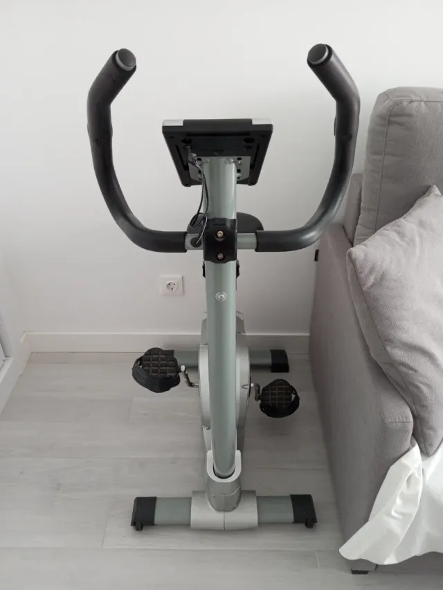 Bicicleta estática de color gris, ideal para entrenar en casa. Cuenta con un diseño moderno y funcional. - Manillar ergonómico. - Pedales con agarre. - Pantalla digital.