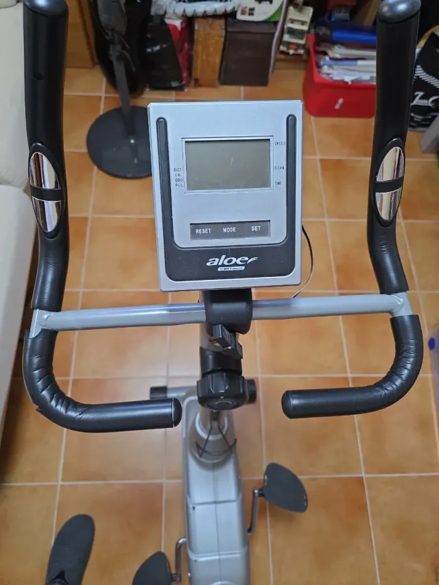 Detalles del productoBicicleta estática de la marca Aloe, ideal para entrenamientos en casa.