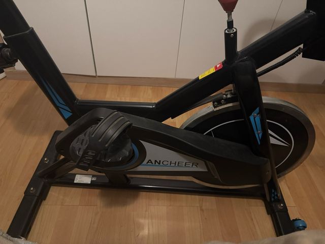 Detalles del productoBicicleta estática de la marca ANCHEER, ideal para entrenamientos en casa. Su diseño es robusto y funcional.