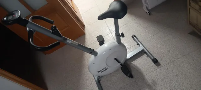 Bicicleta estática de color blanco y gris, ideal para entrenamientos en casa. - Diseño compacto. - Sillín ajustable. - Manillar ergonómico. - Pantalla digital.