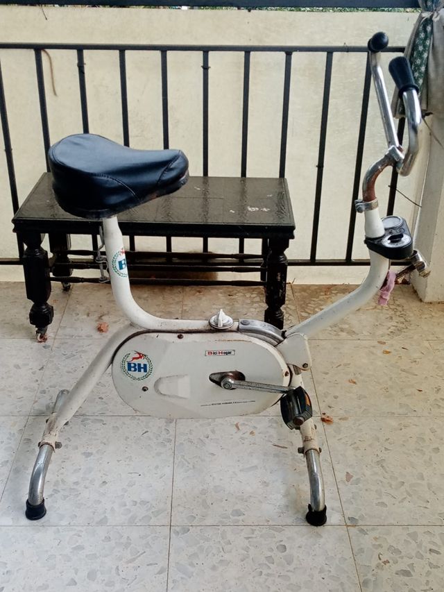 Bicicleta estática de la marca BH, un modelo antiguo con un diseño clásico. - Asiento acolchado. - Manillar cromado. - Estructura de metal blanca.