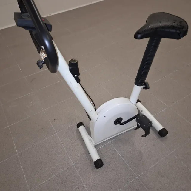 Bicicleta estática de color blanco, ideal para entrenar en casa. - Diseño compacto. - Asiento ajustable. - Manillar ergonómico.