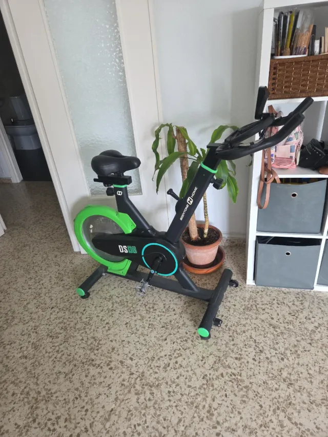 Bicicleta estática de spinning en color negro y verde. - Manillar ajustable. - Sillín acolchado. - Pedales con agarre. - Rueda de inercia.