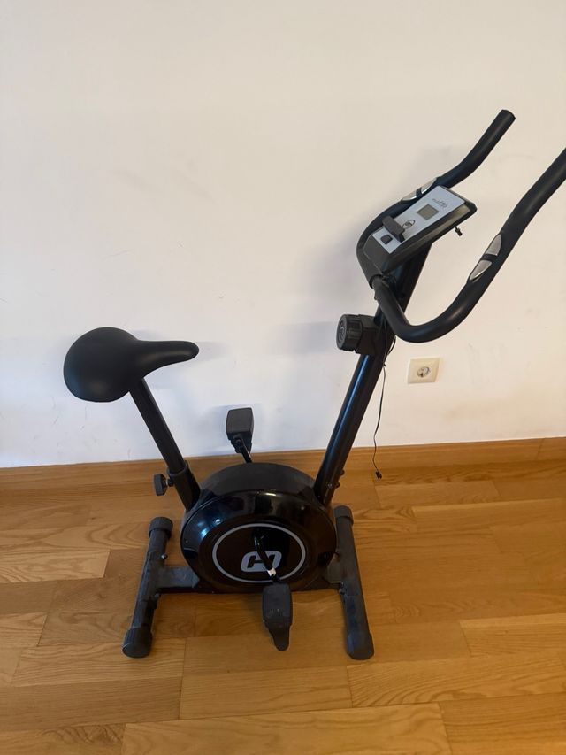 Bicicleta estática de color negro, ideal para entrenamientos en casa. - Diseño compacto. - Pedales con agarre.