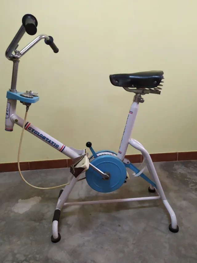 Bicicleta estática de la marca CYCLOSTATIC. - Estructura de metal blanco. - Asiento negro. - Manillar plateado con puños negros. - Rueda de resistencia azul.