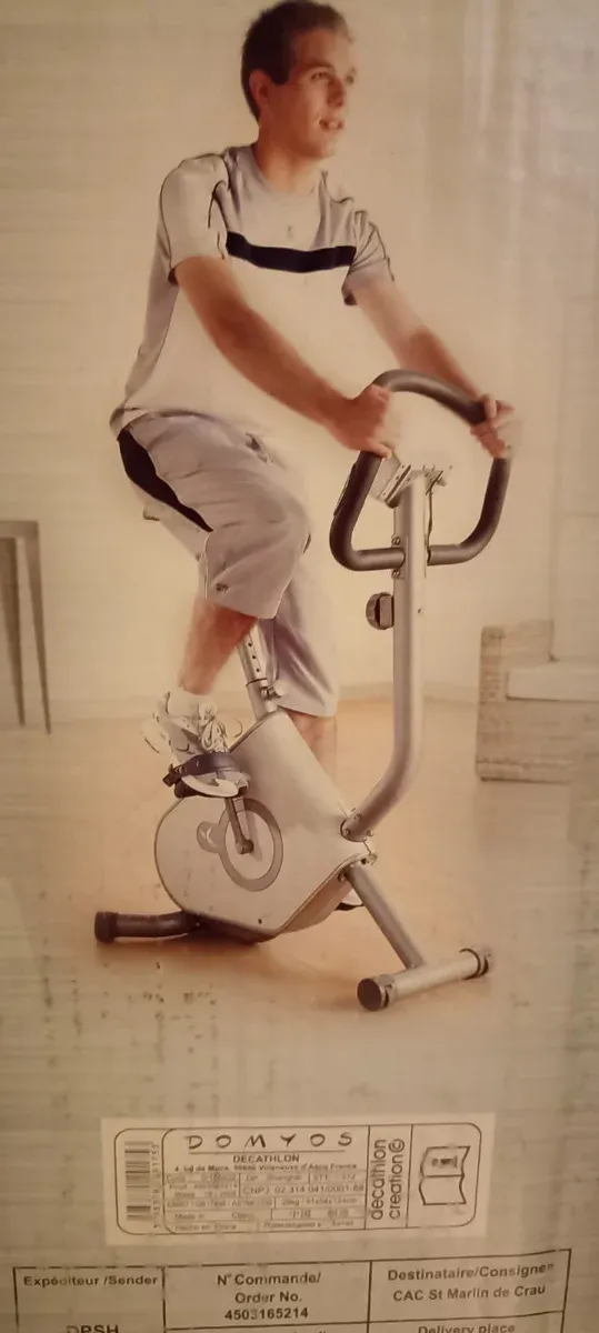 Detalles del productoBicicleta estática de la marca DOMYOS, ideal para entrenamientos en casa.