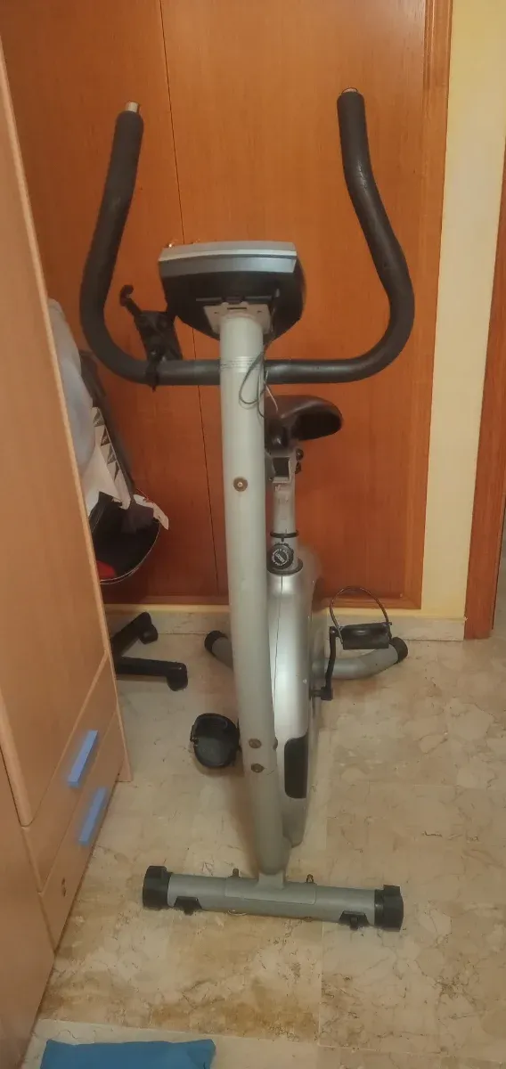 Detalles del productoBicicleta estática de la marca Domyos, ideal para entrenamientos en casa. Su diseño es compacto y funcional.