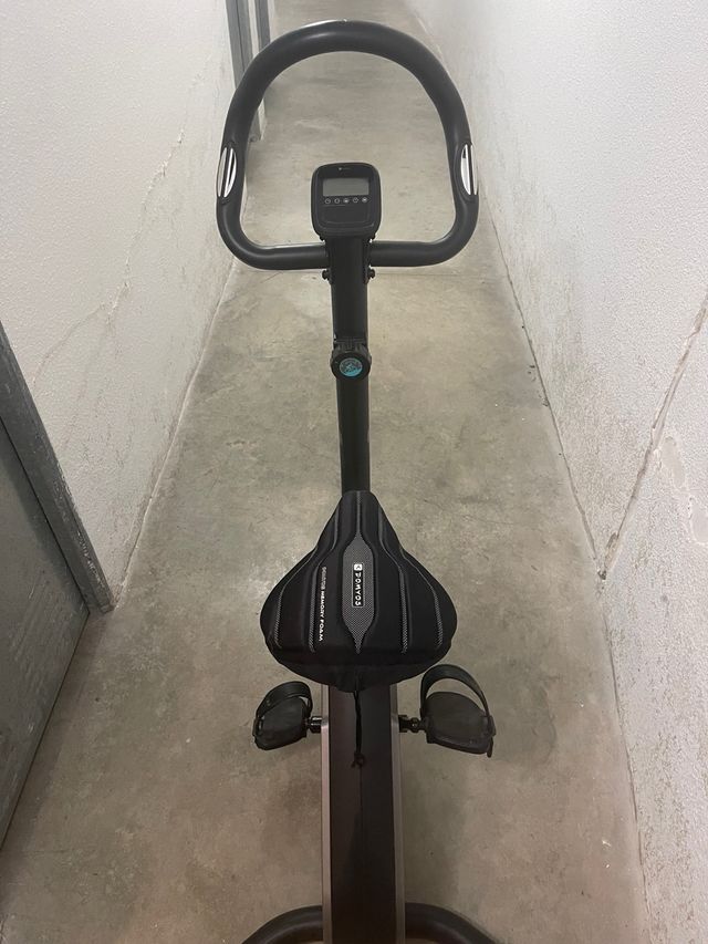 Detalles del productoBicicleta estática de la marca Domyos, ideal para entrenamientos en casa. Cuenta con un sillín acolchado para mayor comodidad.