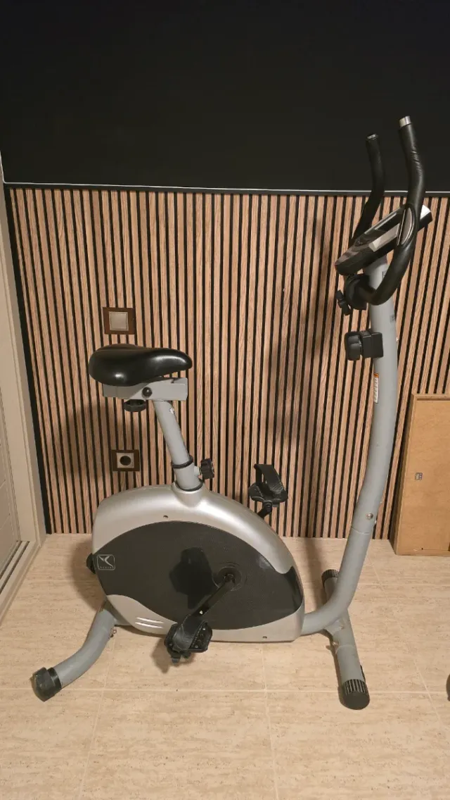 Detalles del productoBicicleta estática Domyos en color gris, ideal para entrenamientos en casa.